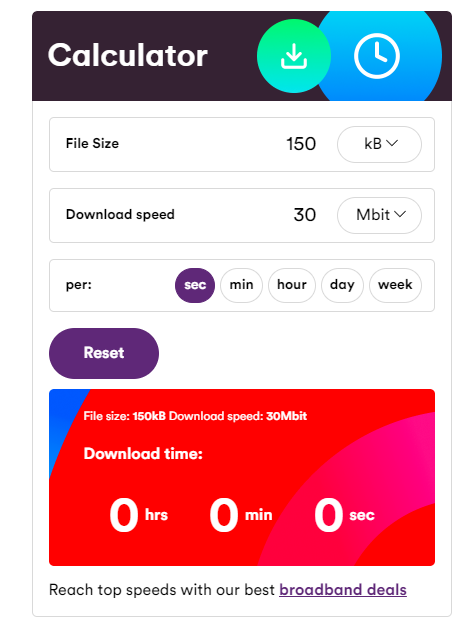 A Simple download time calculator, All the stuff you would expect from a Download Time Calculator, but in a slightly fresher skin than most of them.